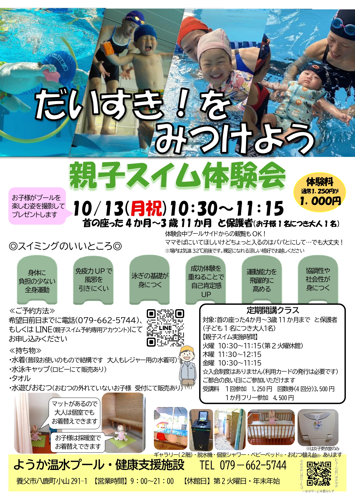 9月の体験会ご好評につき、10/13(月祝)にも親子スイム体験会を実施いたします。