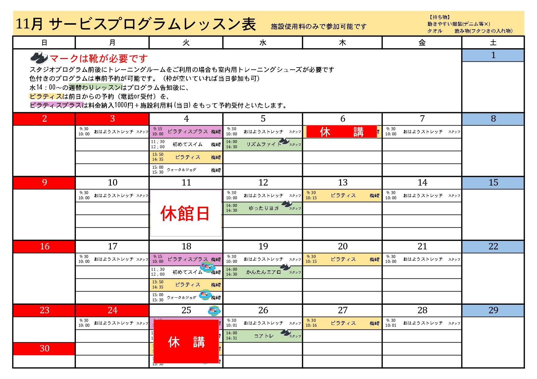 サービスプログラムレッスン表更新しました!(11月分)