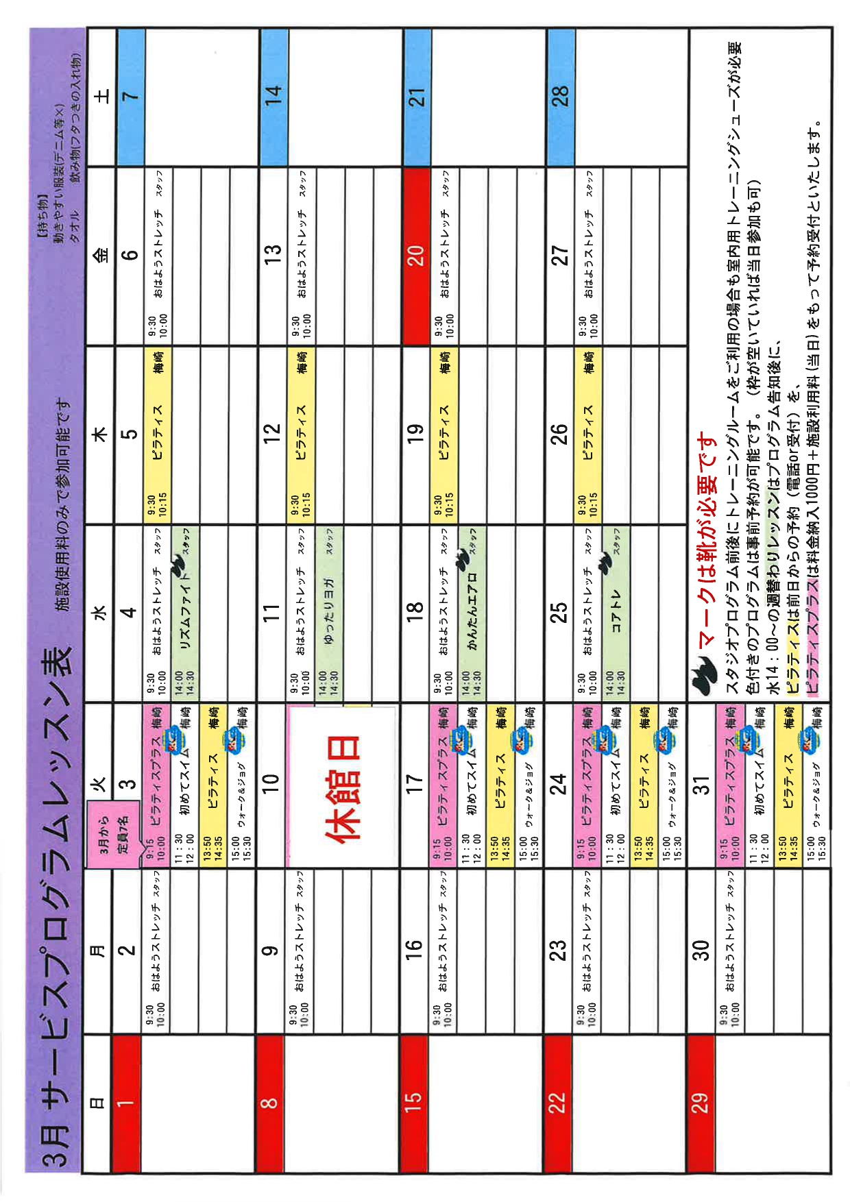 サービスプログラムレッスン表更新しました!(3月分)