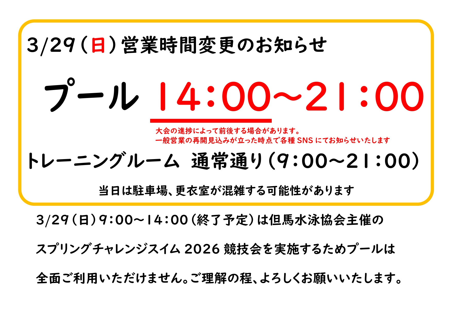 3/29(日)大会開催に伴うプール営業時間変更のお知らせ